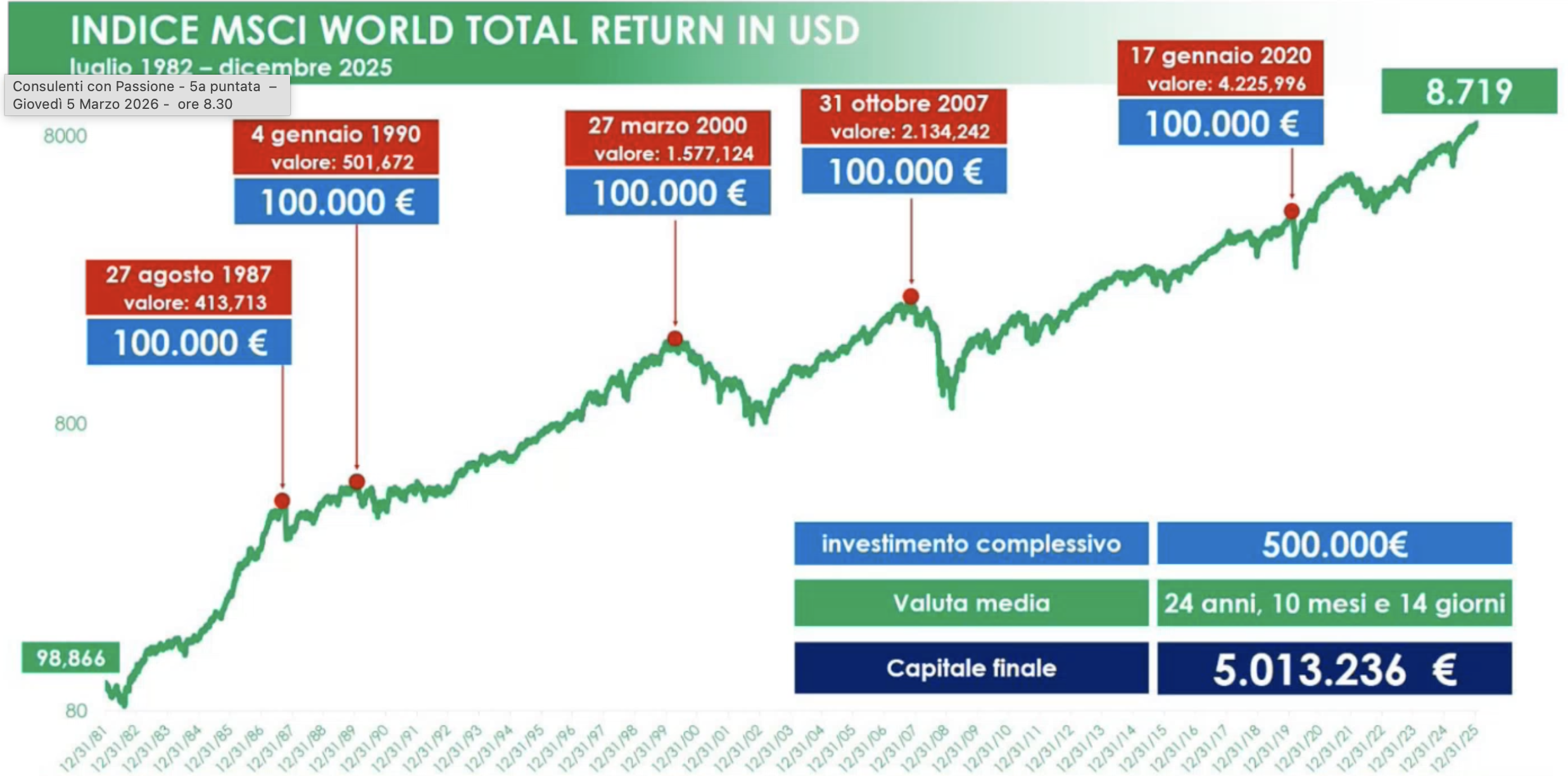 Negli ultimi quarant’anni avrebbe investito cinque volte, sempre nei momenti peggiori, per un totale di 500.000 euro. Nonostante questo pessimo tempismo, con un orizzonte medio di circa venticinque anni, senza mai vendere il suo investimento, oggi il suo capitale sarebbe comunque diventato di oltre cinque milioni di euro, decuplicato.